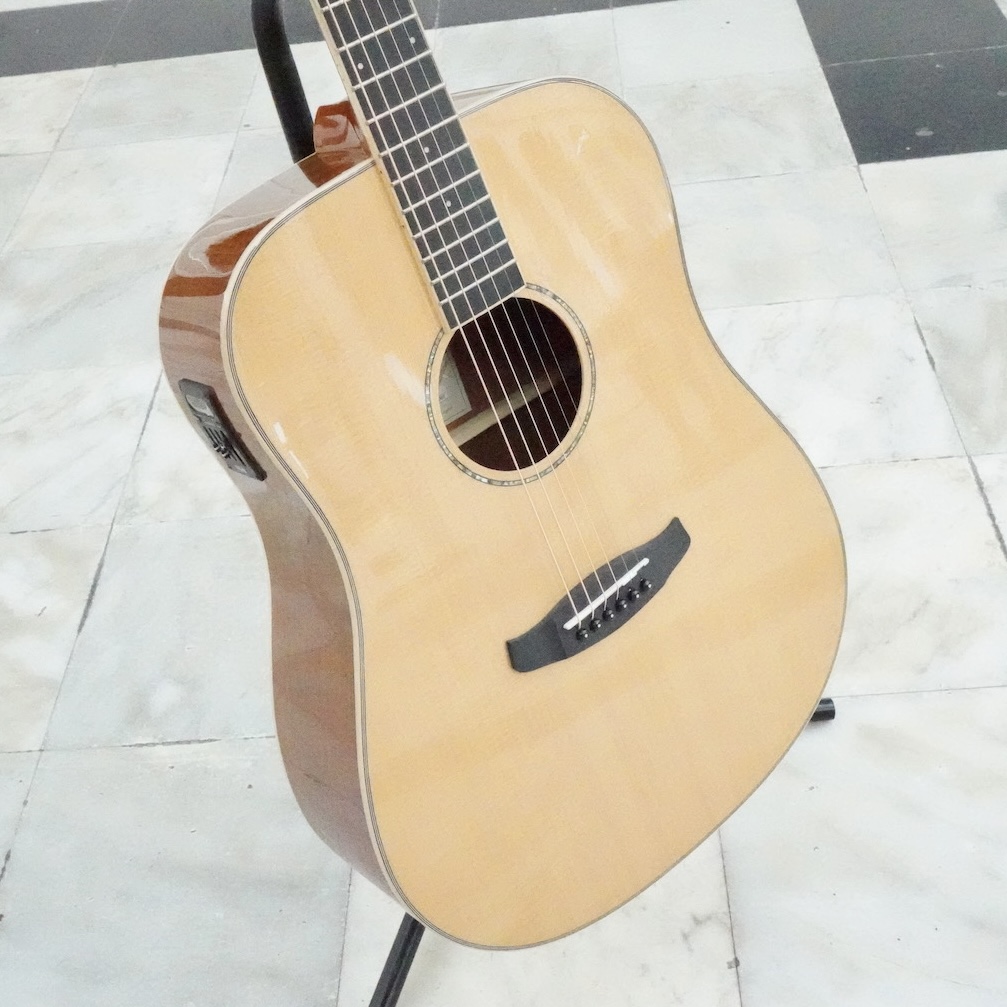 At the heart of the TRX5E is a Spruce top, a wood known for its bright, clear, and dynamic tonal characteristics. The Spruce top gives the guitar an excellent level of projection, ensuring that every note rings out with a crisp, defined sound. The combination of Spruce with Ovangkol back and sides adds a layer of warmth and complexity to the tone. Ovangkol, with its dense and vibrant nature, provides a deep and rich resonance, creating a perfect balance between bright clarity and warm, mellow undertones. This pairing of woods makes the TRX5E a versatile instrument, suitable for a wide range of musical genres and playing styles.