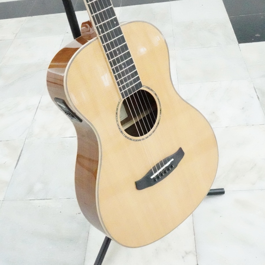 The guitar features a high-quality Spruce top, renowned for its bright, clear, and well-balanced sound. Spruce is an ideal choice for the top, as it enhances the guitar’s projection, allowing the notes to ring out with crispness and clarity. Paired with Ovangkol back and sides, the TRX8E’s sound is further enriched with warmth and depth. Ovangkol is a dense and durable wood that contributes a unique, mellow tonal quality, which complements the brightness of the Spruce top. This combination of woods ensures the guitar produces a balanced sound that is both expressive and full-bodied.
