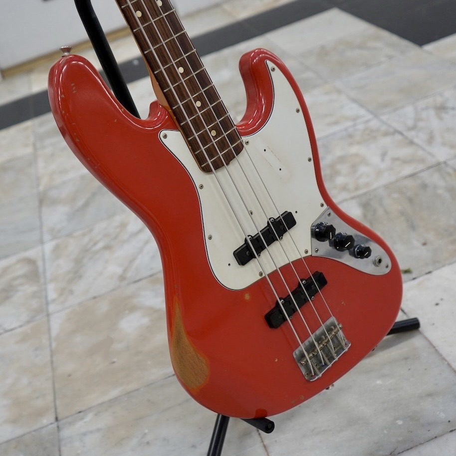 Absolutely glorious Road Worn series Jazz Bass in an excellent shade of Fiesta Red. Features an aged white pick guard instead of the original tortoiseshell.
